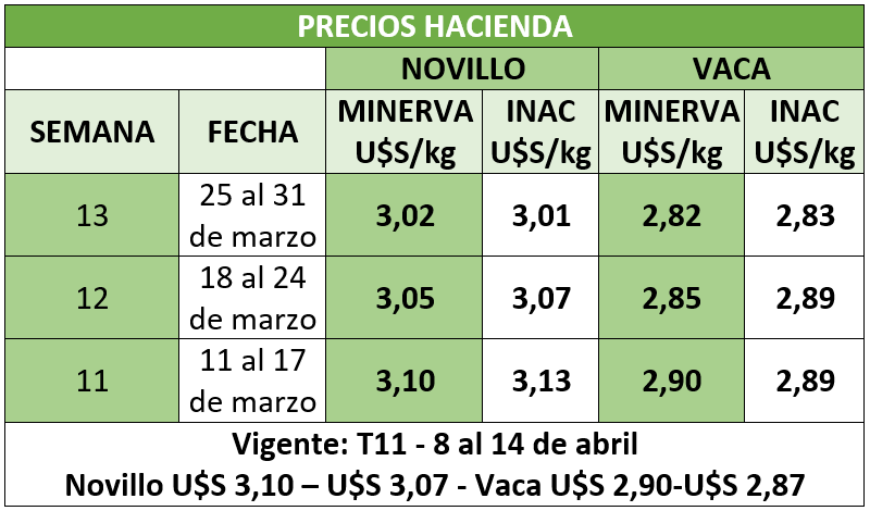 Por la presente le informamos los precios de la tabla de MINERVA Foods y los publicados por INAC.