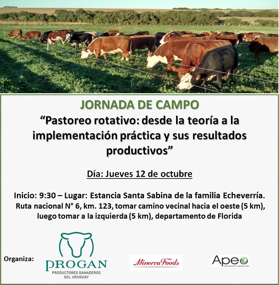 Mediante la presente los invitamos a participar de la jornada de campo: “Pastoreo rotativo: desde la teoría a la implementación práctica y sus resultados productivos”, que se realizará el día jueves 12 de octubre, en el establecimiento Santa Sabina de la familia Echeverría.